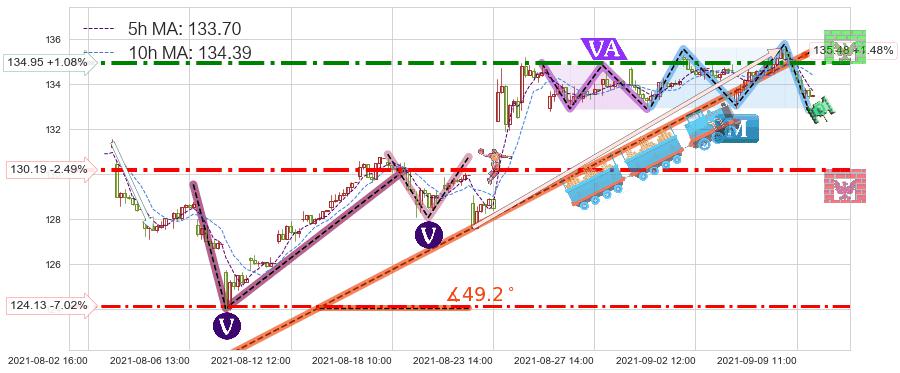 ♘ 阻力价格位134.95,可信任强度77.81%,距离最后交易2021-09-09 15:00形成的收盘价格133.51相差 +1.08%