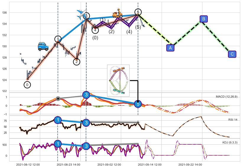 ➢ 1,3,5驱动浪MACD, RSI, KDJ走势都出现【常规背离】反转信号增强