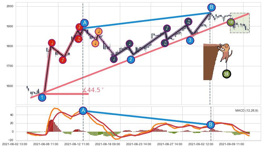 从2021-08-17 12:00至2021-09-02 13:00,共包含81个小时,阶段股价上涨10.55%,阶段股价变动位移路程比: 1 : 3,上涨趋势角度: 43.8