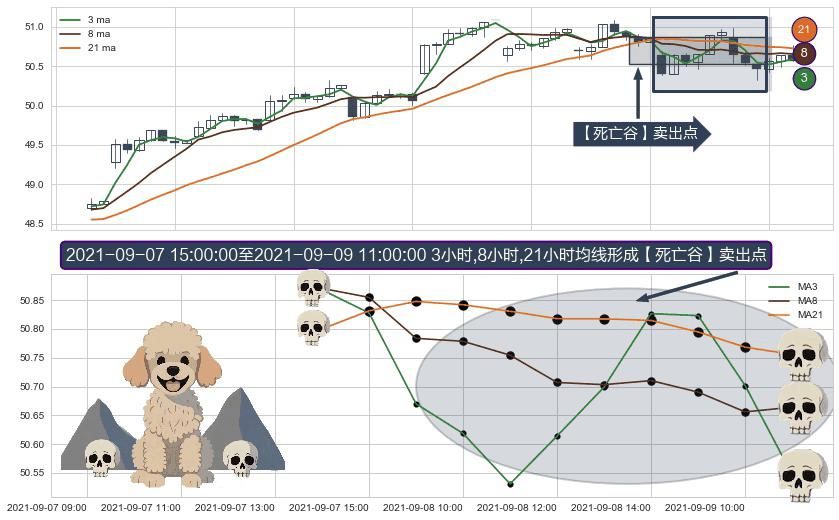 ⚀ 2021-09-08 09:00:00-小时至2021-09-09 11:00:00-小时显现 3小时-8小时-21小时均线 【死亡谷】卖出点 看空信号,后市看跌,卖出