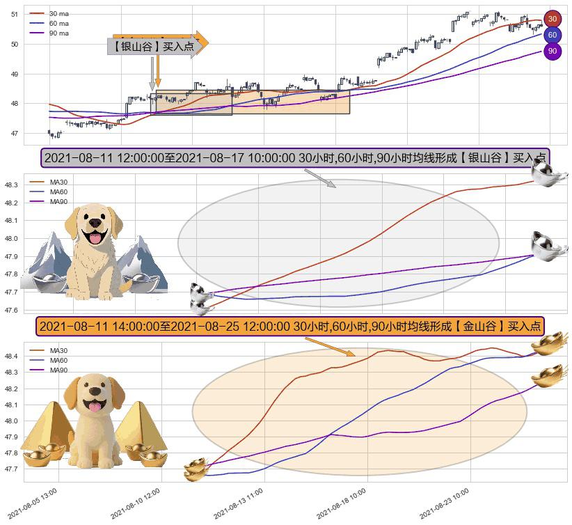 ⚀ 2021-08-11 15:00:00-小时至2021-08-25 12:00:00-小时显现 30小时-60小时-90小时均线 【金山谷】买入点 其再次确认了买入信号,可靠性更强,买入