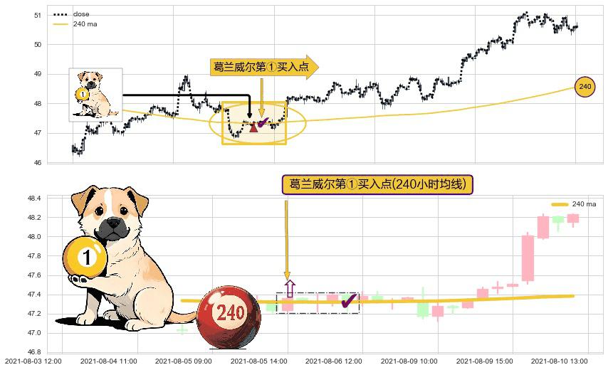 ⚀ 2021-08-05 14:00:00-小时显现 葛兰威尔均线 240小时均线 第买①入点 走势反转见底信号,后市看涨,买进信号