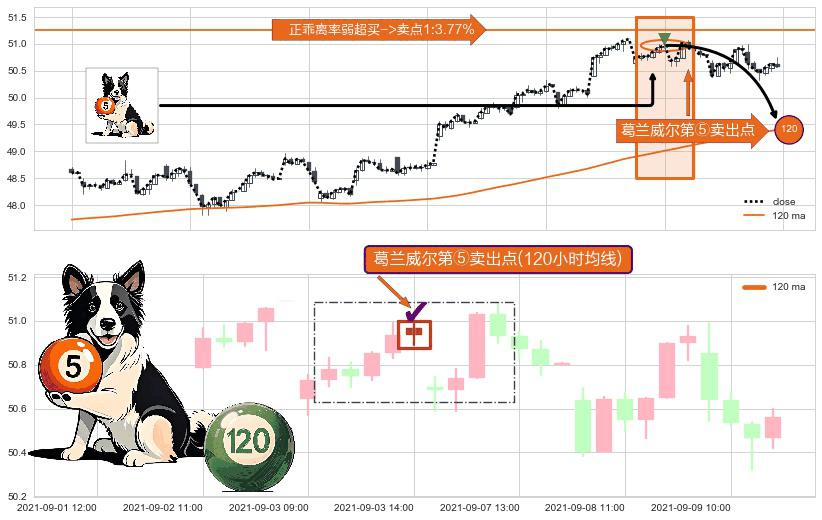⚀ 2021-09-03 14:00:00-小时显现 葛兰威尔均线 120小时均线 第⑤卖出点 上升趋势均值回复的短线回落信号,后市看跌,卖出信号