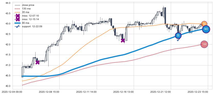 ⚅ 买点向上突破均线后,价格走势很纠结,不断在均线周围试探,有再次下探破位均线的可能