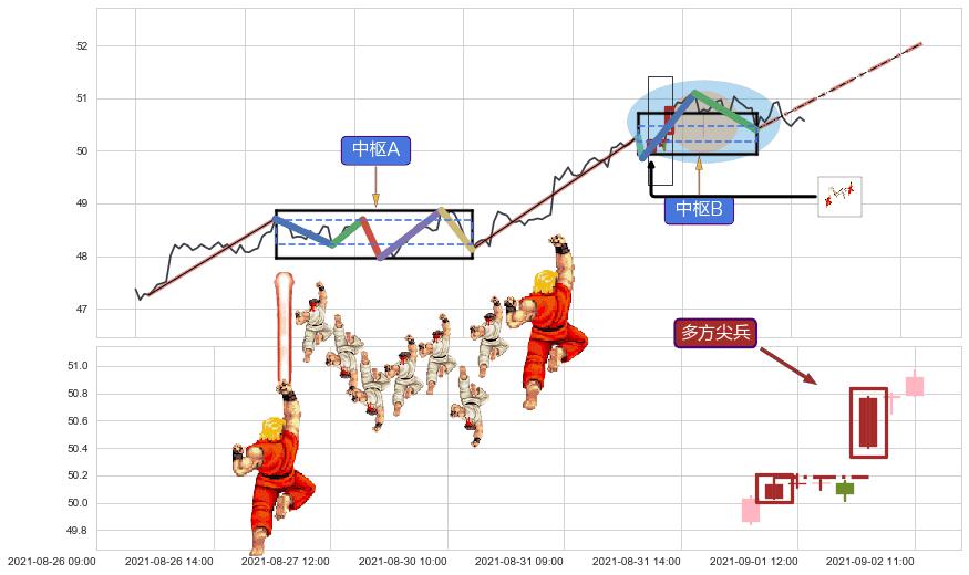 ➣ 【中枢B】:08-31:15-09-08:09,中枢由4笔构成,共28交易小时, ZG=50.40, ZD=50.26