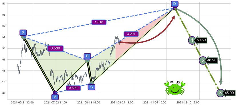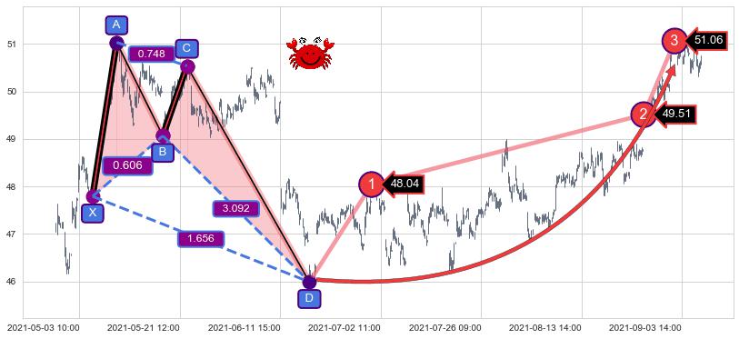 ➢ 距离预测D点位置有足够的上涨空间, 与看跌【螃蟹】形态相反,实际方向【看涨】