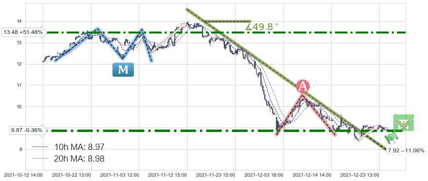 从2021-11-12 15:00至2021-12-21 14:00,共包含187个小时,阶段股价下跌-40.58%,阶段股价变动位移路程比: 1 : 4,下跌趋势角度: 49.8