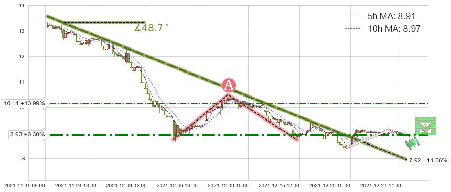 ♘ 阻力价格位8.93,可信任强度74.63%,距离最后交易2021-12-27 15:00形成的收盘价格8.90相差 +0.30%