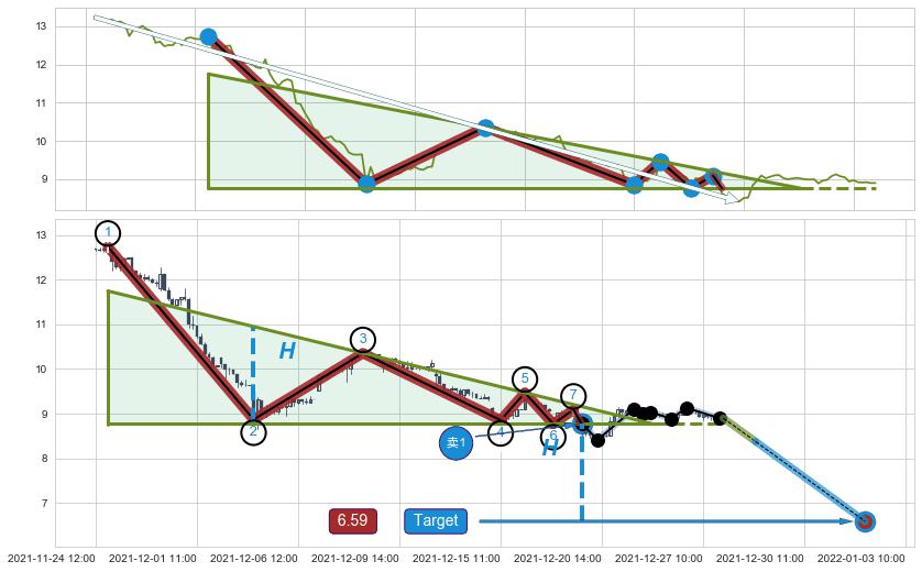 ➣ D点拟合预测价格11.80,距离最后交易收盘价格8.90相差 +32.56%