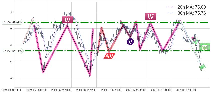 ♞ 20小时均线:75.09,30小时均线:75.76→ 快线<慢线