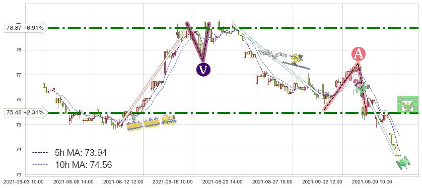 ♘ 阻力价格位75.48,可信任强度77.78%,距离最后交易2021-09-09 14:00形成的收盘价格73.77相差 +2.31%