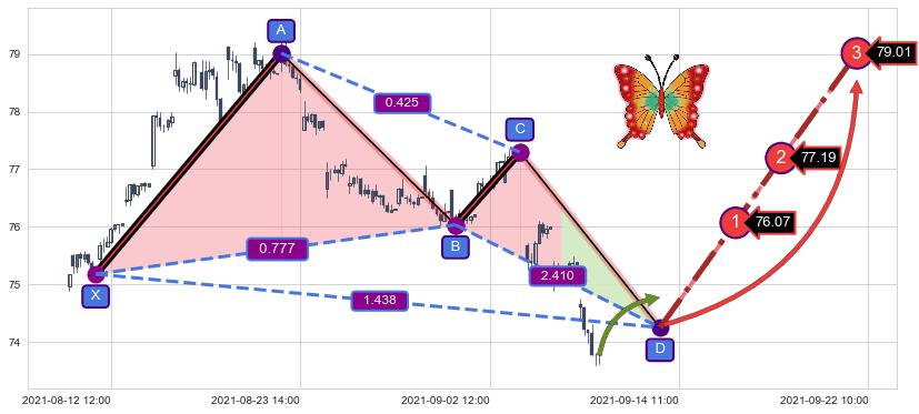 ➢ 接近预测D点位置, 随时警戒看涨【蝴蝶】形态反转启动