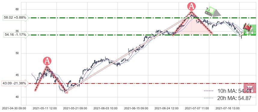 ♘ 阻力价格位54.16,可信任强度65.36%,距离最后交易2021-07-19 15:00形成的收盘价格54.80相差 -1.17%