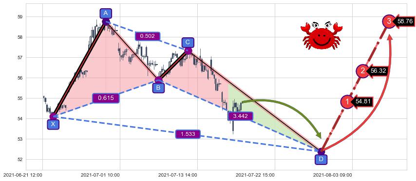 ➢ 距离预测D点位置有足够的下跌空间, 与看涨【螃蟹】形态相反,实际方向【看跌】