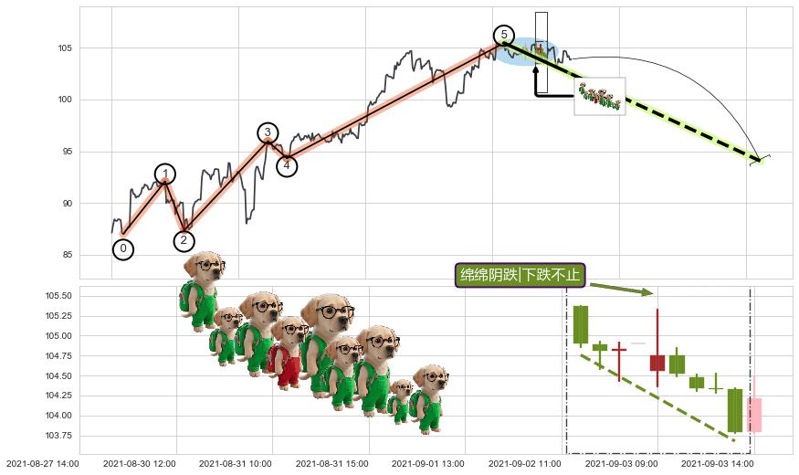 | 3 🅚:下跌两颗星 | 下跌三颗星 ➕ 🌊:波浪理论猜想上涨浪5已形成,猜想后续形成回调abc下跌(均值回复) ☞ 看空信号 ⇥ 【🅚线】交织【图形】⇥ 综合量化分数: 49 | > |