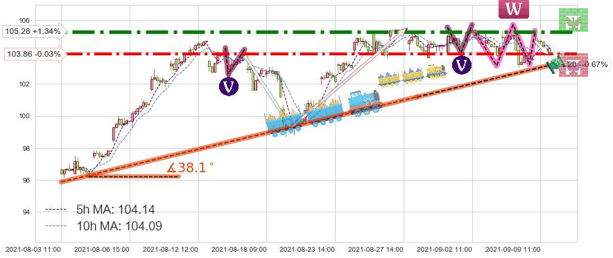 ♞ 5小时均线:104.14,10小时均线:104.09→ 快线>慢线