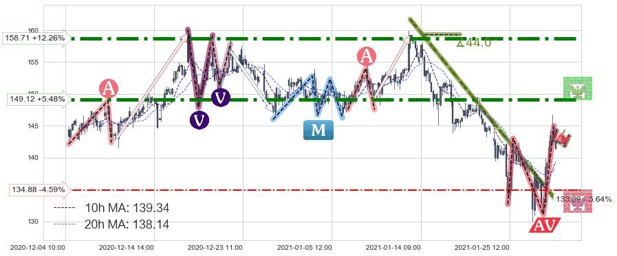 ♘ 阻力价格位149.12,可信任强度99.00%,距离最后交易2021-01-28 16:00形成的收盘价格141.37相差 +5.48%