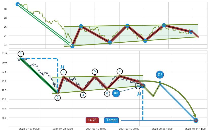 从2021-06-23 09:00至2021-08-06 12:00,共包含203个小时,阶段股价下跌-21.05%,阶段股价变动位移路程比: 1 : 8,下跌趋势角度: 64.3