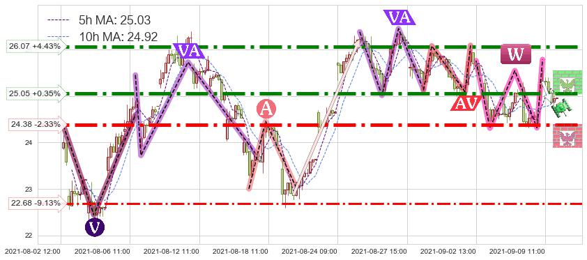 从2021-08-25 11:00至2021-08-30 14:00,共包含24个小时,阶段股价下跌-3.32%,阶段股价变动位移路程比: 1 : 3