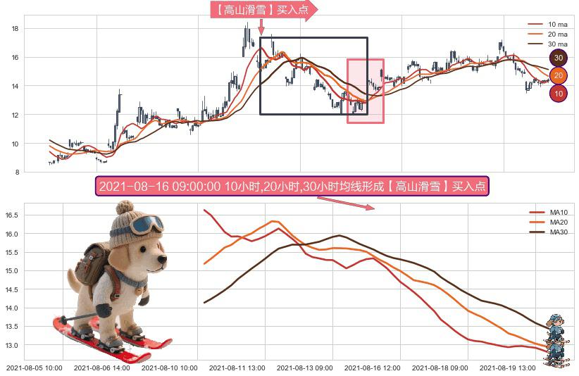 ⚀ 2021-08-10 11:00:00小时-2021-08-19 15:00:00小时显现 10小时-20小时-30小时均线 【高山滑雪】买入点 看多信号,后市看涨,买入