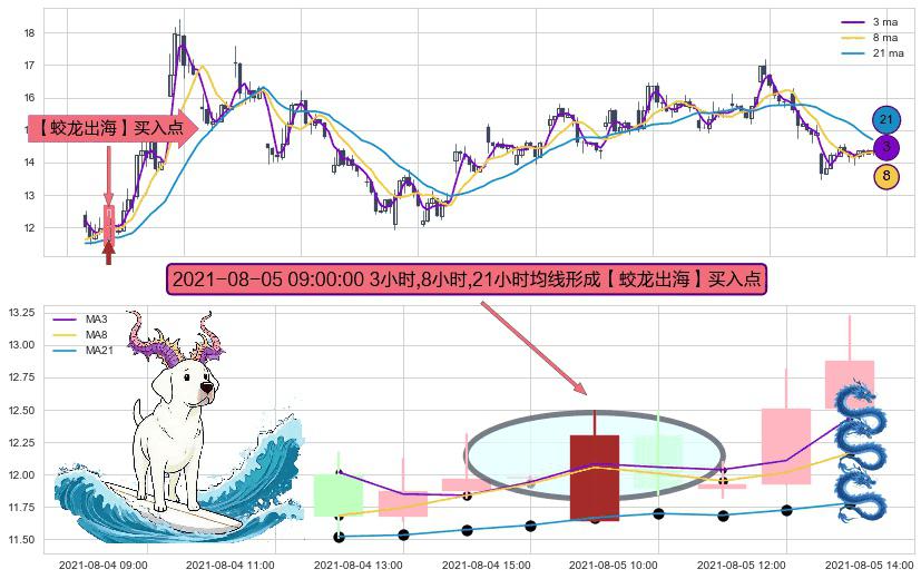 ⚀ 2021-08-05 09:00:00小时显现 3小时-8小时-21小时均线 【蛟龙出海】买入点 看多信号,后市看涨,买入