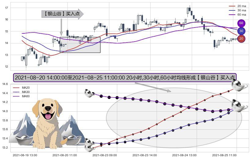 ⚀ 2021-08-20 15:00:00-小时至2021-08-25 11:00:00-小时显现 20小时-30小时-60小时均线 【银山谷】买入点 看多信号,后市看涨,买入