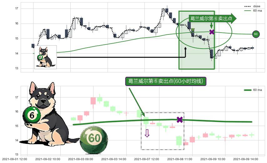 ⚀ 2021-09-07 10:00:00-小时显现 葛兰威尔均线 60小时均线 第⑥卖出点 走势反转见顶信号,后市看跌,卖出信号