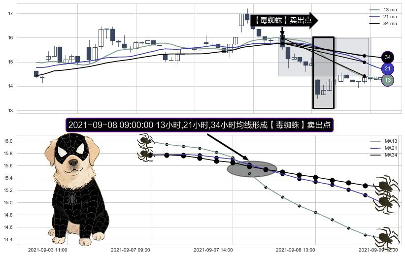 ⚀ 2021-09-08 09:00:00小时显现 13小时-21小时-34小时均线 【毒蜘蛛】卖出点 看空信号,后市看跌,卖出
