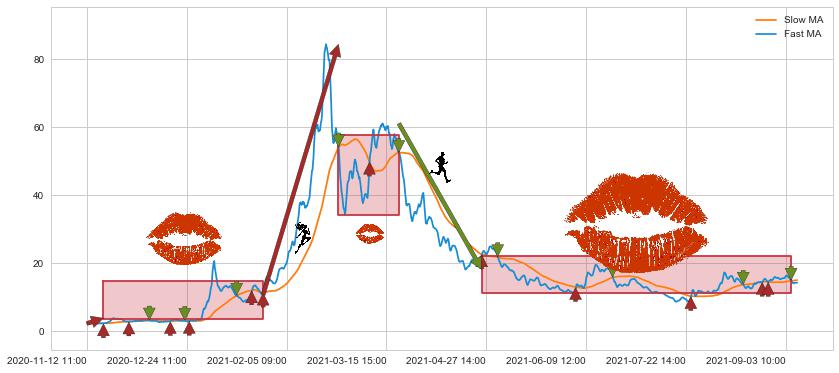 ⚅ 卖点向下突破均线后,价格走势很纠结,不断在均线周围试探,有再次上探突破均线的可能