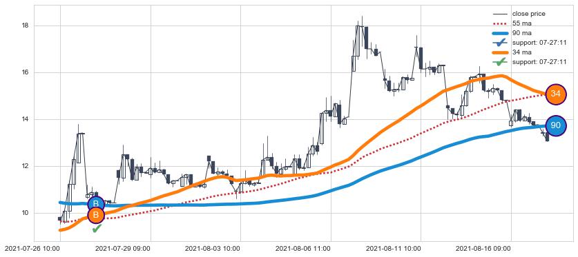 ⚂ 2021-08-05 09:00:00小时突然冒出一根大阳线,一下子顶穿三条均线且收盘价收在各条均线之上