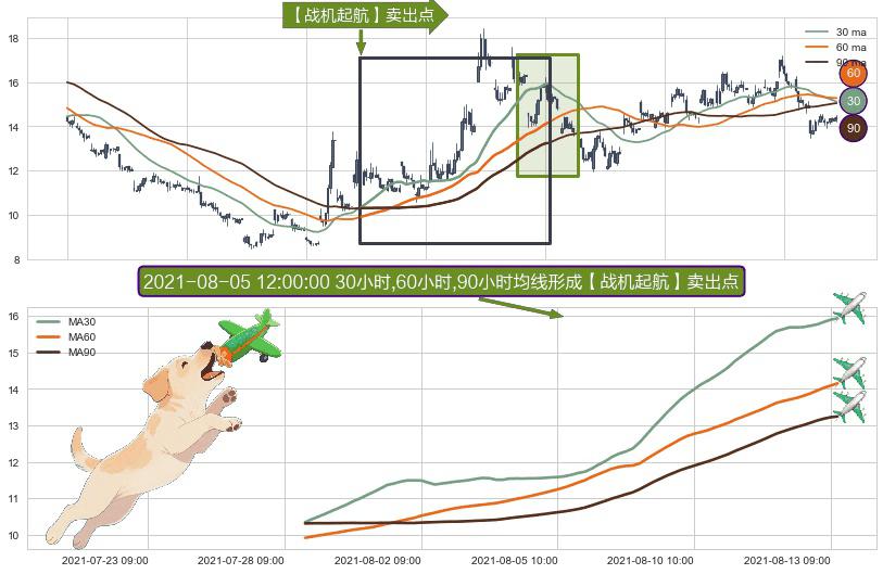 ⚀ 2021-07-28 12:00:00小时-2021-08-13 10:00:00小时显现 30小时-60小时-90小时均线 【战机起航】卖出点 看空信号,后市看跌,卖出