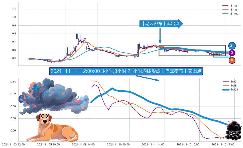 ⚀ 2021-11-08 13:00:00小时-2021-11-16 12:00:00小时显现 3小时-8小时-21小时均线 【乌云密布】卖出点 看空信号,后市看跌,卖出