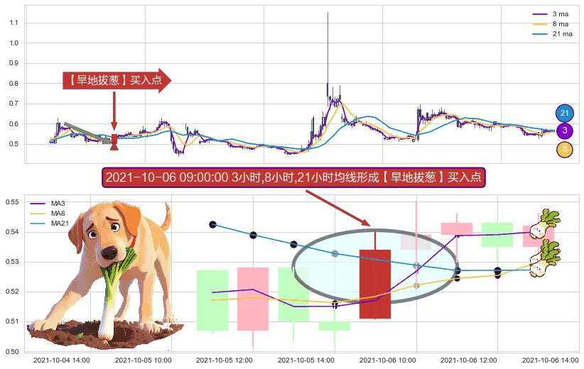 ⚀ 2021-10-06 09:00:00小时显现 3小时-8小时-21小时均线 【旱地拔葱】买入点 看多信号,后市看涨,买入