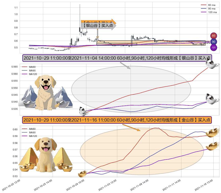 ⚃ 2021-10-29 12:00:00-小时至2021-11-16 11:00:00-小时显现 60小时-90小时-120小时均线 【金山谷】买入点 其再次确认了买入信号,可靠性更强,买入