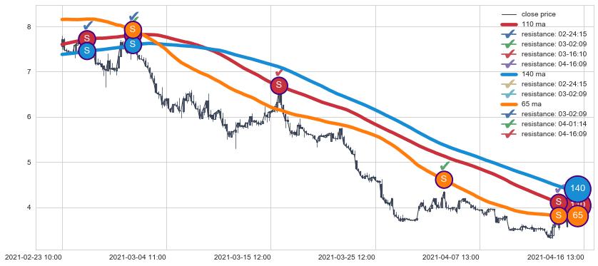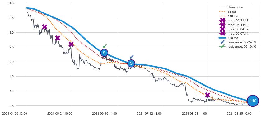 ⚁ MA3和MA8走势平行,且始终保持在短距离内,MA21始终在短中期均线上方,与短中期均线保持一定的距离,微微下行