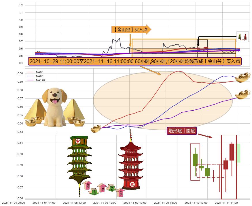 | 4 🅚:底部尽头线(上山虎) ➕ 🎢:【金银山谷】买入点均线组合买入点信号形成后,猜想后续突破上升,沿着向上的尖头三角上涨 ☞ 看多信号 ⇥ 【均线】交织【🅚线】⇥ 综合量化分数: 52 | > |