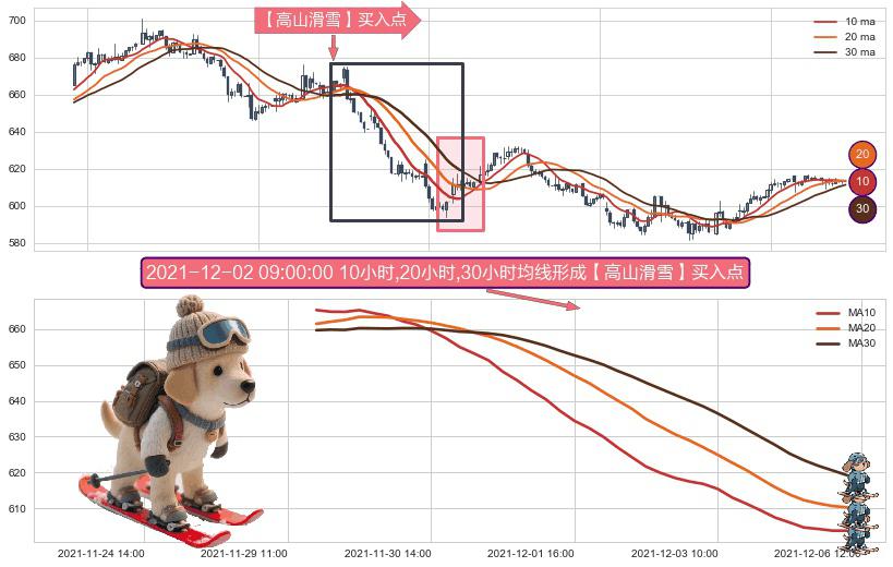 ⚀ 2021-11-29 13:00:00小时-2021-12-06 11:00:00小时显现 10小时-20小时-30小时均线 【高山滑雪】买入点 看多信号,后市看涨,买入
