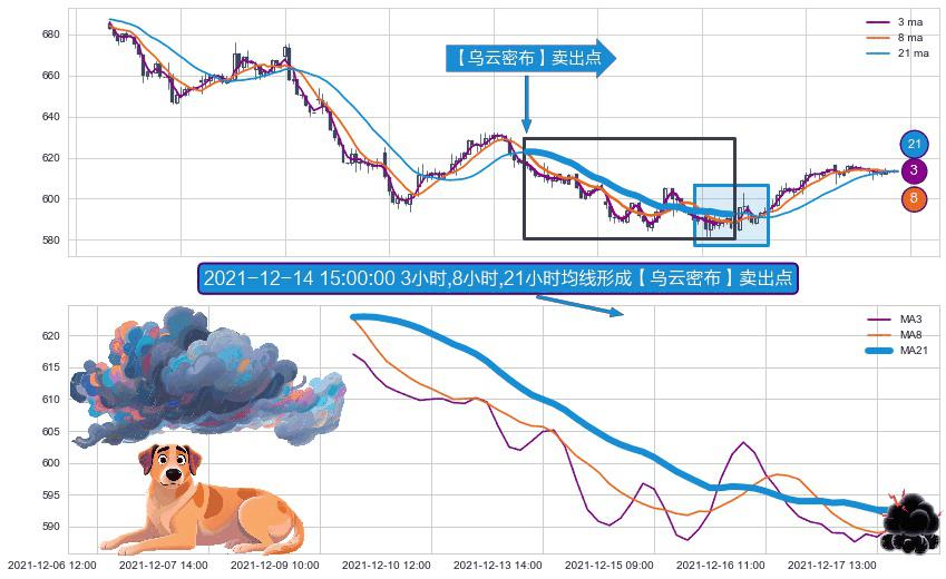 ⚀ 2021-12-09 13:00:00小时-2021-12-17 15:00:00小时显现 3小时-8小时-21小时均线 【乌云密布】卖出点 看空信号,后市看跌,卖出