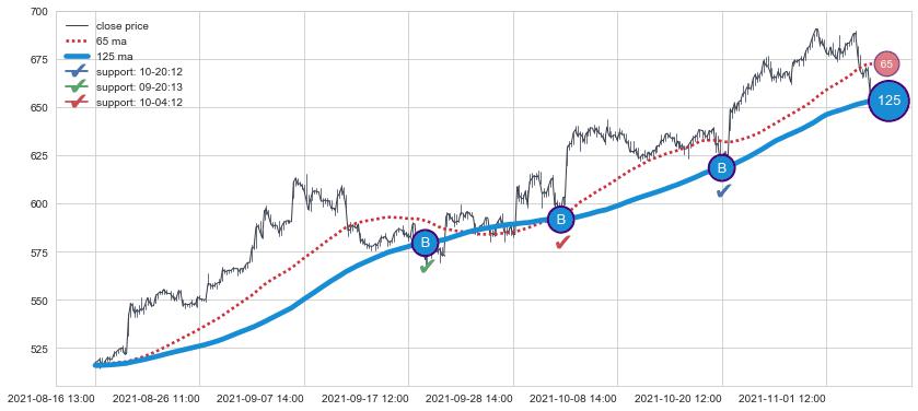 ➢ 最优均线组合共正确确认支撑阻力信号13处,正确确认率 72.22%