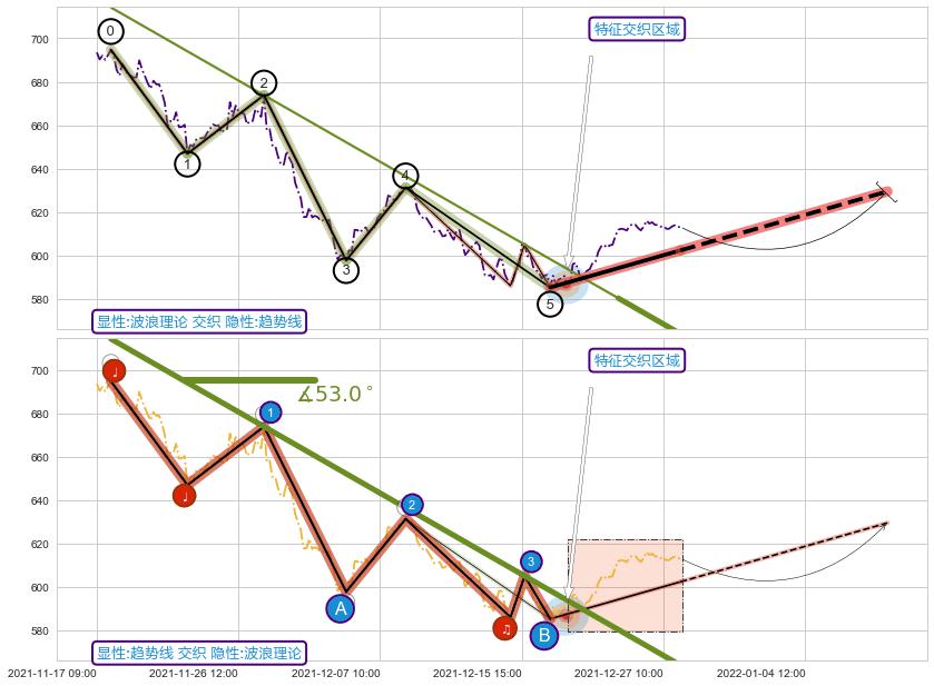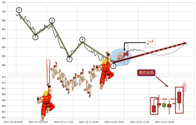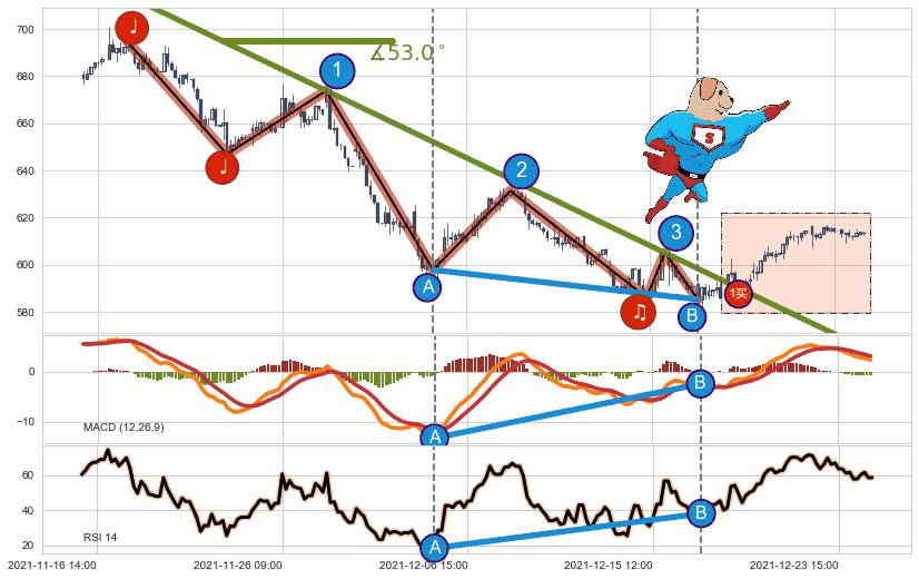 ➢ 最后的下跌趋势2021-11-17 14:00至2021-12-22 10:00:存在突破迹象,后续小反弹或者反转上涨