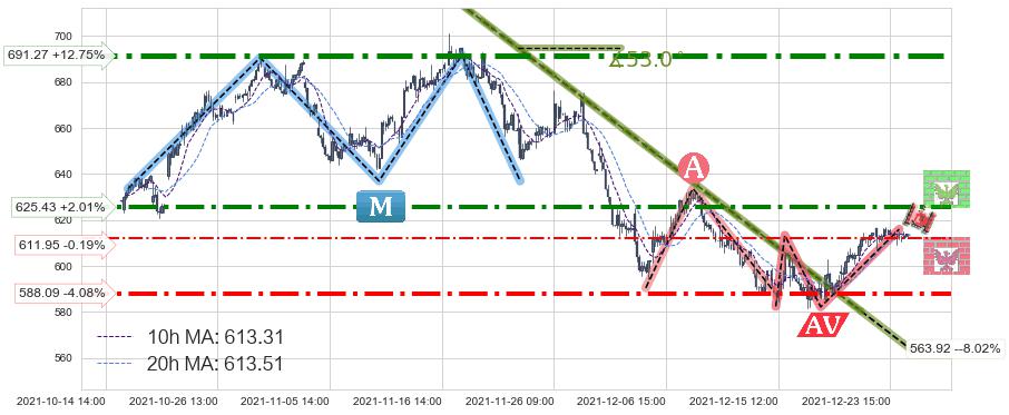♘ 阻力价格位625.43,可信任强度75.08%,距离最后交易2021-12-27 16:00形成的收盘价格613.12相差 +2.01%