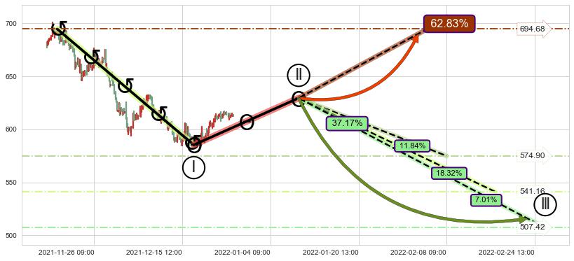 ♘ 阻力价格位691.27,可信任强度94.77%,距离最后交易2021-12-27 16:00形成的收盘价格613.12相差 +12.75%