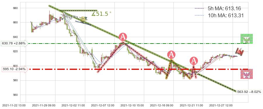 ♘ 阻力价格位630.78,可信任强度49.94%,距离最后交易2021-12-27 16:00形成的收盘价格613.12相差 +2.88%