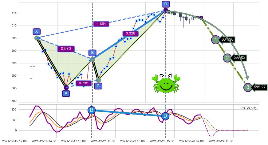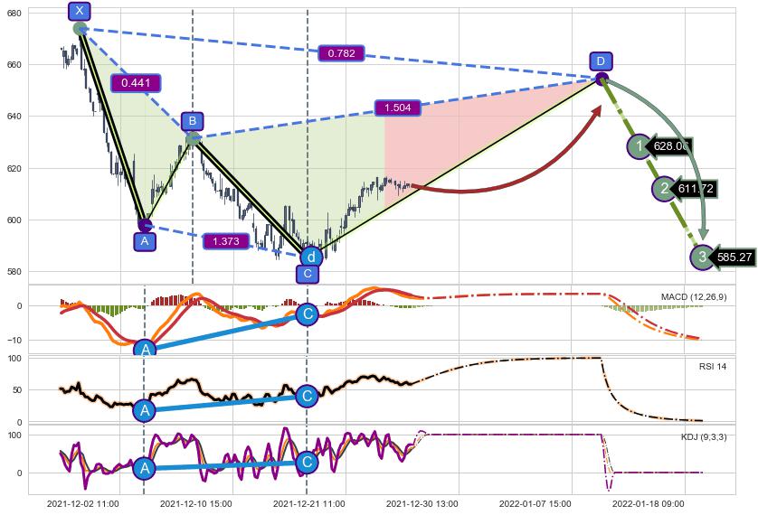 ➣ D点拟合预测价格654.52,距离最后交易收盘价格613.12相差 +6.75%