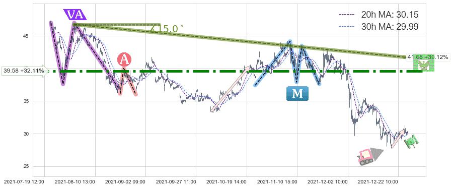 从2021-08-02 09:00至2021-12-23 15:00,共包含654个小时,阶段股价下跌-36.09%,阶段股价变动位移路程比: 1 : 15,下跌趋势角度: 15.0