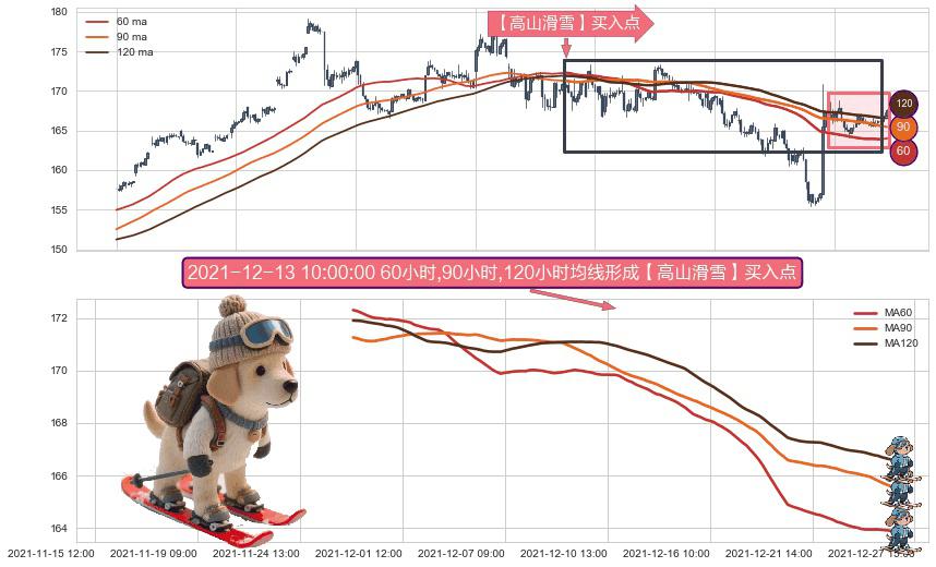 ⚀ 2021-11-29 14:00:00小时-2021-12-27 12:00:00小时显现 60小时-90小时-120小时均线 【高山滑雪】买入点 看多信号,后市看涨,买入