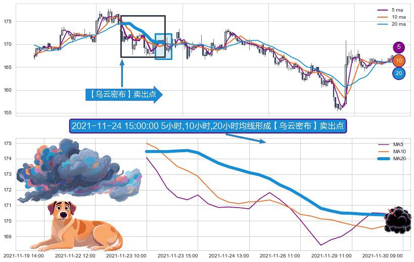 ⚀ 2021-11-23 10:00:00小时-2021-11-29 15:00:00小时显现 5小时-10小时-20小时均线 【乌云密布】卖出点 看空信号,后市看跌,卖出