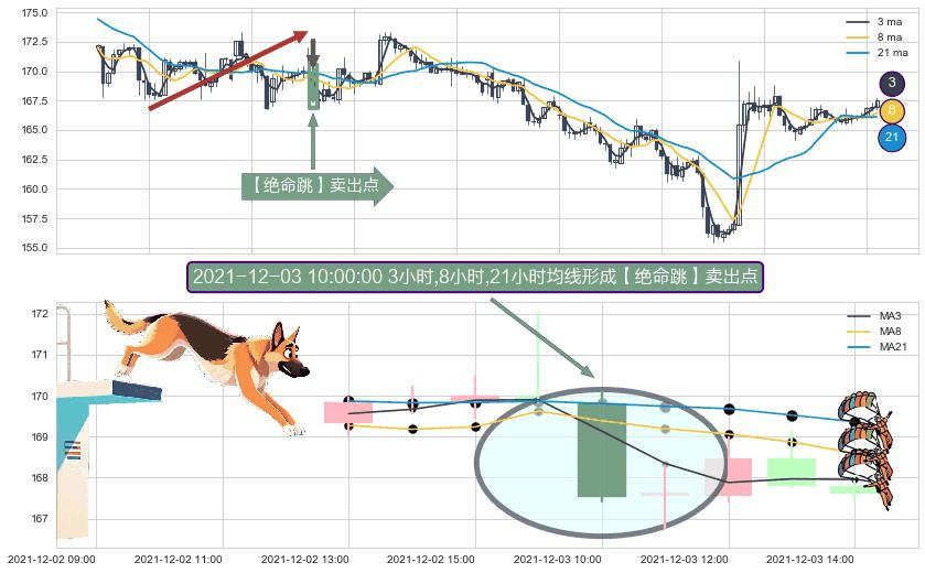 ⚀ 2021-12-03 10:00:00小时显现 3小时-8小时-21小时均线 【绝命跳】卖出点 看空信号,后市看跌,卖出