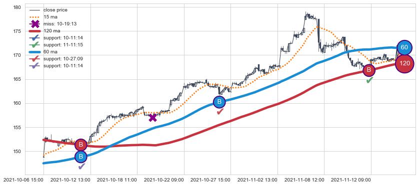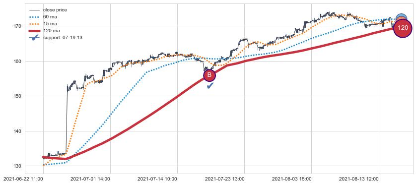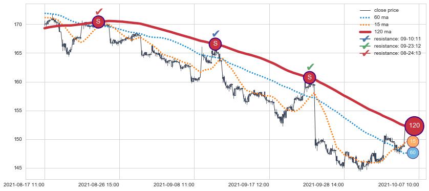 ➢ 最优均线组合共正确确认支撑阻力信号12处,正确确认率 70.59%