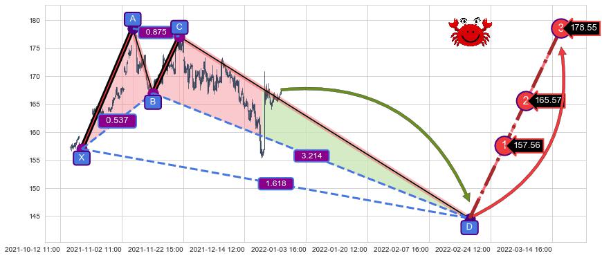 ➢ 距离预测D点位置有足够的下跌空间, 与看涨【螃蟹】形态相反,实际方向【看跌】